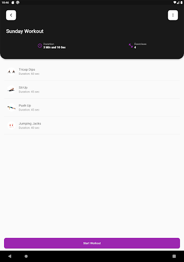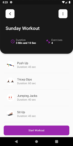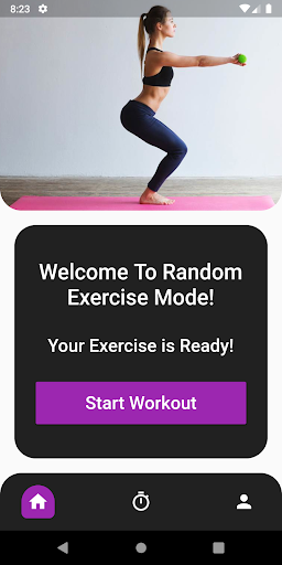 - Random Mode: Where user are given random different exercises and they are allowed to select the number of sets and start workout.