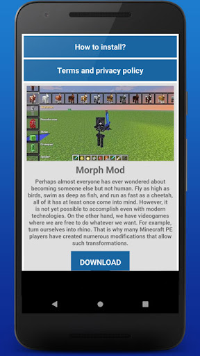 The app Morph Mod For Minecraft is an app that gives you the opportunity to turn into any mob or item in minecraft.