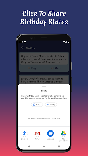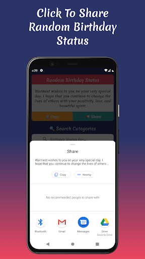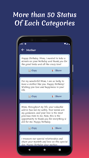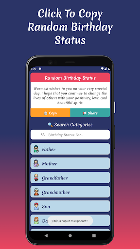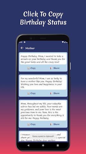 Worried about the hassle of copying and pasting? Fear not! The "Birthday Status" app offers a simple one-click copy feature, allowing you to effortlessly save your favorite statuses to your clipboard. You can also share your chosen status directly to Facebook, Instagram, WhatsApp, or any other social platform with just a tap! 📱💬