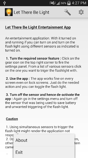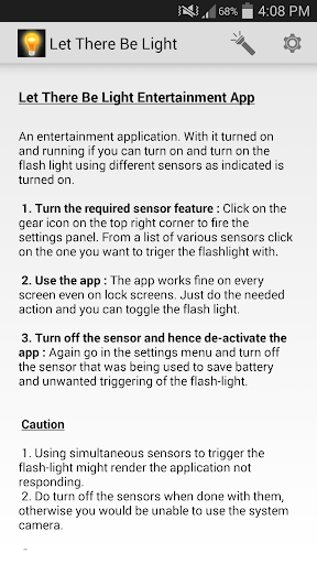 First time in history we present to you an application that has features such as to Toggling flash-light when shaken as well as Toggling flash-light when waved over and even Toggling flash-light when blown at.