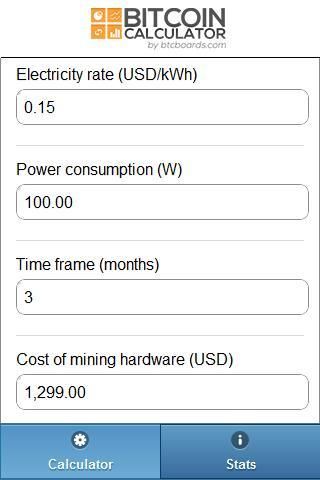 Bitcoin Calculator is a detailed, quick and easy to use bitcoin mining profitability calculator. It takes in your hash rate, cost of mining hardware, electicity rate, power consumption, time frame and fetches live the current difficulty, bitcoins per block and exchange rate (USD/BTC), and displays your net profit per time frame and more.