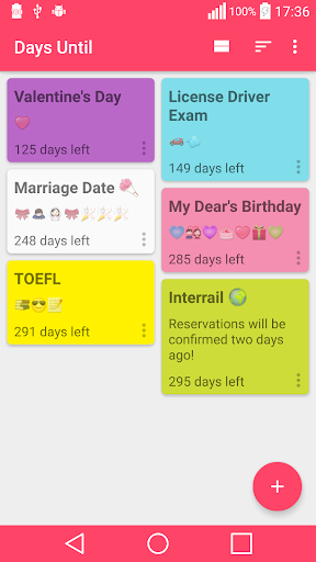 Keywords: Days Until, How Many Days Until, Time Until, Day Counter, D-Day, Love Calculator, Love Counter, Wedding Countdown, Pregnancy Countdown, Christmas Countdown, How Many Days Until Christmas , Days Until Halloween, Birthday Reminder App, Drink Water Reminder, Daily Reminder App, Sticky Note Widget, Appointment Reminder, Todo App, Todo Cloud, Set A Reminder, Bill Reminder, Medicine Reminder