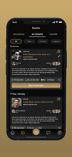 Schedule your future live events. Invite co-hosts and guest speakers, create buzz and build your community by sharing links and get direct access to people interested in your content.
