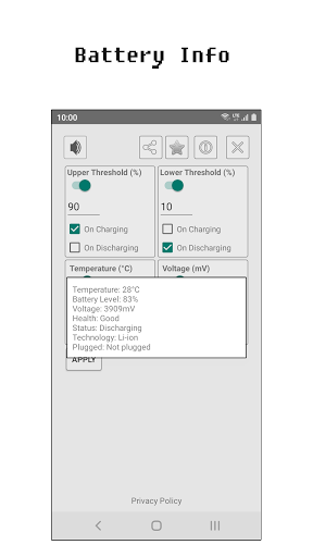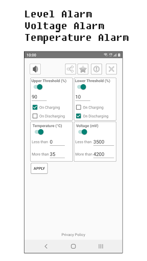 - Full and Low level alarm (when battery is overcharged or discharged).