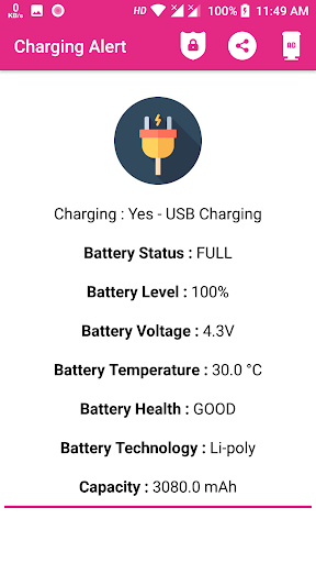 This application give alert with high volume alarm when the battery is fully charged and You will never forget the phone on charger for a long period In today's busy schedule it is very hard to check the battery status again and again. This is an unique app which notifies the mobile phone user with he help of battery alarm