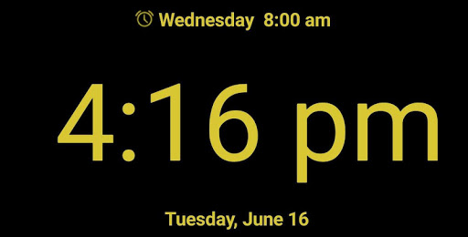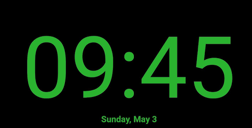 * Full screen * Always landscape orientation. * 24 hour or AM/PM time format. * Date and upcoming alarm display. * No Ads.
