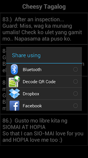 Be ready to see the greatest Pinoy Pick Up Lines! Boom!! This app contain a list of different pick-up lines which you can use on a guy or girl friend. With unique categories to choose from : Malulupet, Funny English, Funny Tagalog, Senator Miriam Defensor-Santiago, Pambasag and