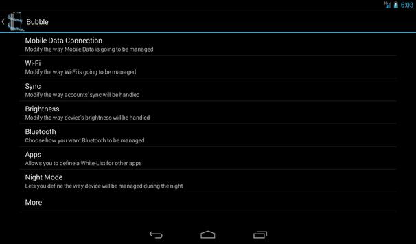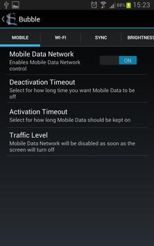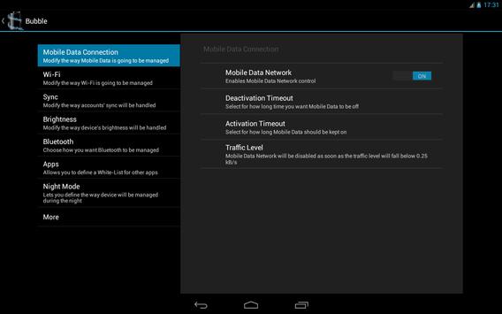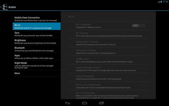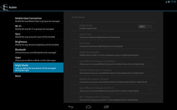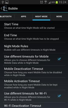 - Change the way Bubble manages Wi-Fi and Mobile Data while at night: choose among having flight mode enabled at night, keeping both Wi-Fi and Mobile Data disabled or changing data timeouts for one or both of them!