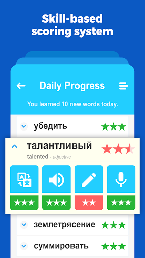 Learn Russian in a fun and effective way: If you have just started language training, consider long-term progress. Build the habit of learning at least 5 words a day. Review what you've learned with spaced repetition. Blarma prepares an ideal Russian learning program for you.
