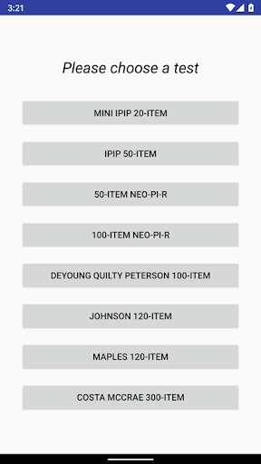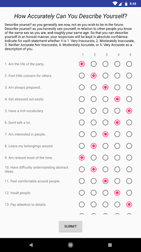 This app will help you to take free personality test which gives you accurate scores for the Big Five personality traits. See exactly how you score for Openness, Conscientiousness, Extraversion, Agreeableness, and Neuroticism with this scientific personality assessment.