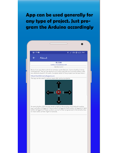 Bluino is an application specifically designed for controlling an Arduino based Obstacle avoidance robot.