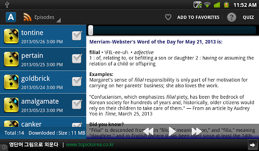 Today's English word from Merriam-Webster dictionary. You can practice your English word pronunciation with Google voice. Listen explanation of the English word from the podcast. Share meaning of English words with friends. Translation also supported. Home screen widget available.Could be a useful tool for English learners.