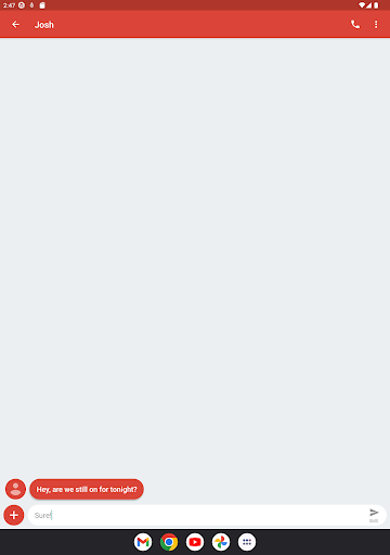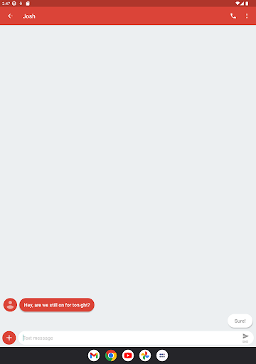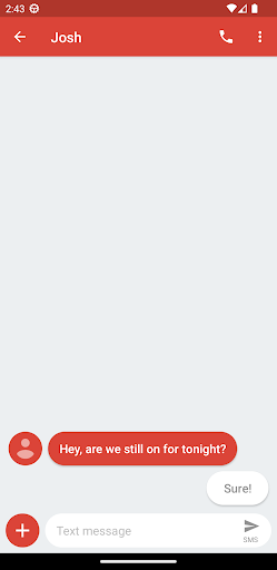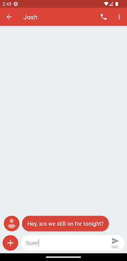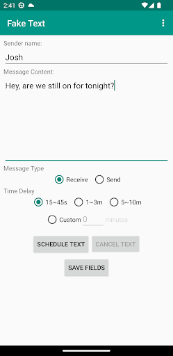 The Fake Text widget allows you to schedule a fake Text with a single press of a button. Simply add the widget to your Android device and click it to schedule a text. Blue icon means it's ready to schedule a text, while red icon means there's a scheduled text in progress.