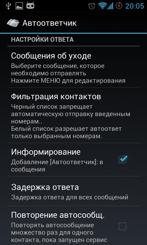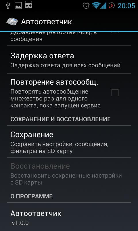 An application that will act as your secretary! Sends a text message when receiving SMS messages and / or a missed call. It is possible to save and restore settings on the memory card of your device.