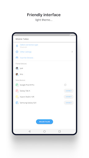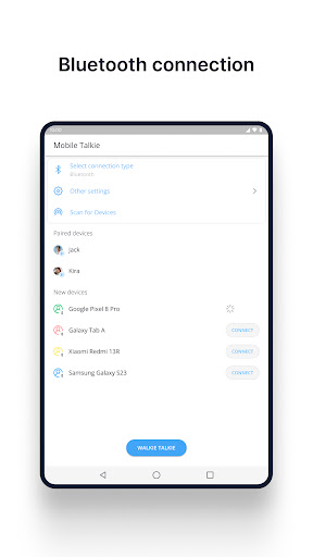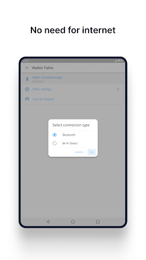 Elevate your communication with our Android app that transforms your device into a versatile walkie-talkie. Enjoy voice and text chat over Bluetooth or Wi-Fi, all without the need for an internet connection. The app features automatic Bluetooth pairing for effortless connections. Engage in conversations with two types of options - push and hold (PTT) for quick messages or click-to-talk for extended discussions. Stay connected effortlessly with this user-friendly walkie-talkie app, perfect for various communication needs. Experience the simplicity of offline voice connectivity. Download now and stay connected anytime, anywhere!