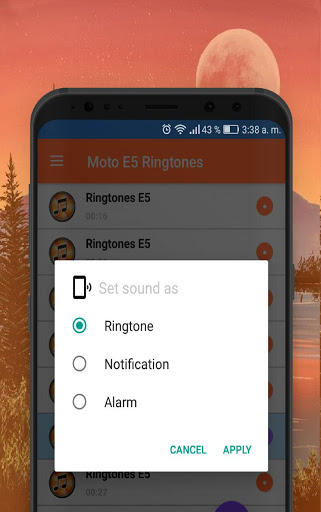Don't forget to keep it in mind as an alarm to start the day with the best tone energy for the moto e5. Share with friends on social networks, Download and fully enjoy the best ringtones application for moto e5 plus, This application allows you to customize sounds for moto e5 play for cell phones and tablets, select your sounds for moto e5 play, alarms, sounds and notifications Favorites since they are all in high quality, sounds for moto e5 short for whatsapp free, ringtones for whatsapp moto e5 short, add them without downloading, What are you waiting to download this app moto e5 play ringtones that will meet your expectations. You need to know what moto e5 plus ringtones is an application with internet connection, with incredible sound quality and the best that is completely free moto e5 ringtones.