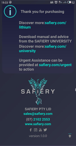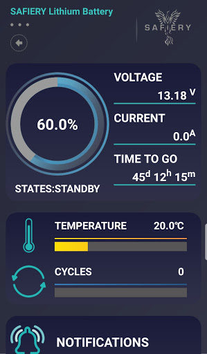 SAFIERY Smart Lithium app shows both the essential data and detailed diagnostic data in the one app. Key essential data is State of Charge, Voltage, Time to Go and Battery Health. Detailed diagnostic data includes cell voltages and alarms. The Notification pages time stamps alarms. There is a link to urgent support.