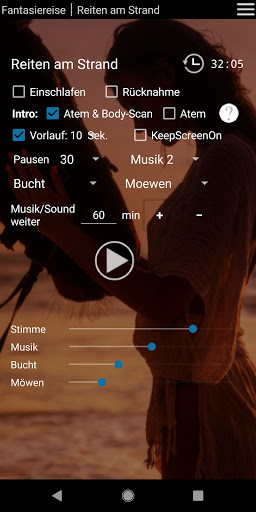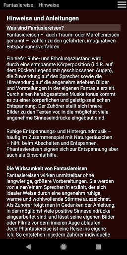 Au début du voyage fantastique, l'initiation d'Intro est éligible: introduction longue / courte / sans introduction. Dans le long intro (9 min), l'exercice de respiration et le balayage corporel sont inclus, ce qui vous amène à une relaxation profonde avant que le voyage fantastique commence. Dans la courte introduction (4 min), il existe une brève écoute avec un exercice de respiration. Sans intro, le fanasite commence immédiatement.