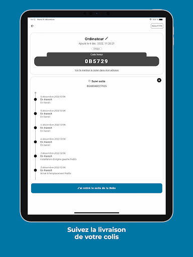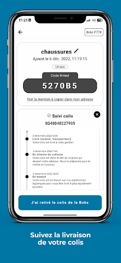 - Suivre l'acheminement vos colis (depuis la prise en charge du transporteur jusqu'a la livraison dans votre Boks) en temps réel