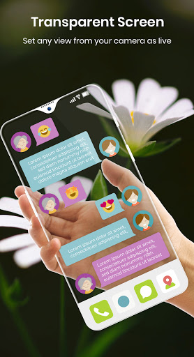 Transparent Screen Background can use your phone as usual, while being able to see the live image of your camera transparently on the entire screen. Use your phone when you are walking, talking, texting, and much more.