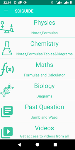 This app is made to aid a student. It has physics, chemistry, mathematics formulas. Physics, chemistry notes . Biology and chemistry diagrams. A unit converter. And even a search bar for education videos and, JAMB and WAEC past questions and answers. It is also lightweight. So what are you waiting for download it, rate it and share it.