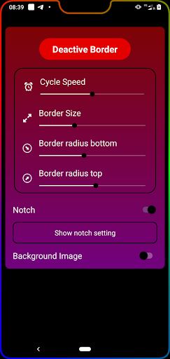 Pro is a live wallpaper that shows a slowly moving colorful border around your screen's edges. It can be adjusted to fit any screen, with or without a notch . Optionally, you can add a normal background image as well.