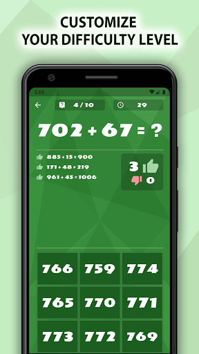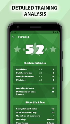 The “Mental Arithmetic" is a dynamic math workout with very flexible settings and detailed statistics. It will be useful for both adults and children because mental math is a great brain workout at any age!