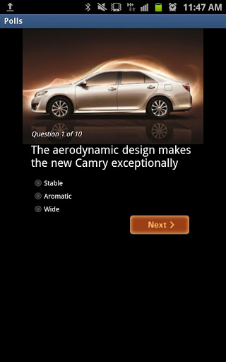 The application has multiple features including a test drive request, quizzes to test your Camry knowledge and more