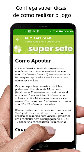 Este aplicativo Super Sete é um gerador de combinações de prognósticos numéricos onde o aplicativo contém 7 colunas com 10 números (de 0 a 9) em cada uma, de forma que o aplicativo deverá gerar de maneira aleatória um número por coluna, auxiliando-o no preenchimento de múltiplos jogos.