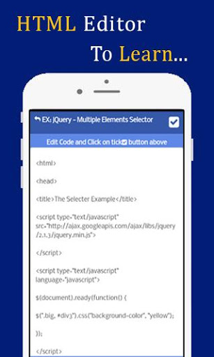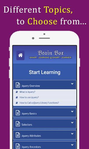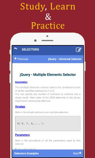 This is the best jquery tutorial app. This app will tech you jquery in very simple and easy way. The best feature of this jquery tutorial app is that it's offline.