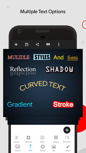 Text effects: make your text stand out with dozens of text effects like : Shadow, Inner Shadow, Stroke, Background, Reflection, Emboss, Mask, 3d text...