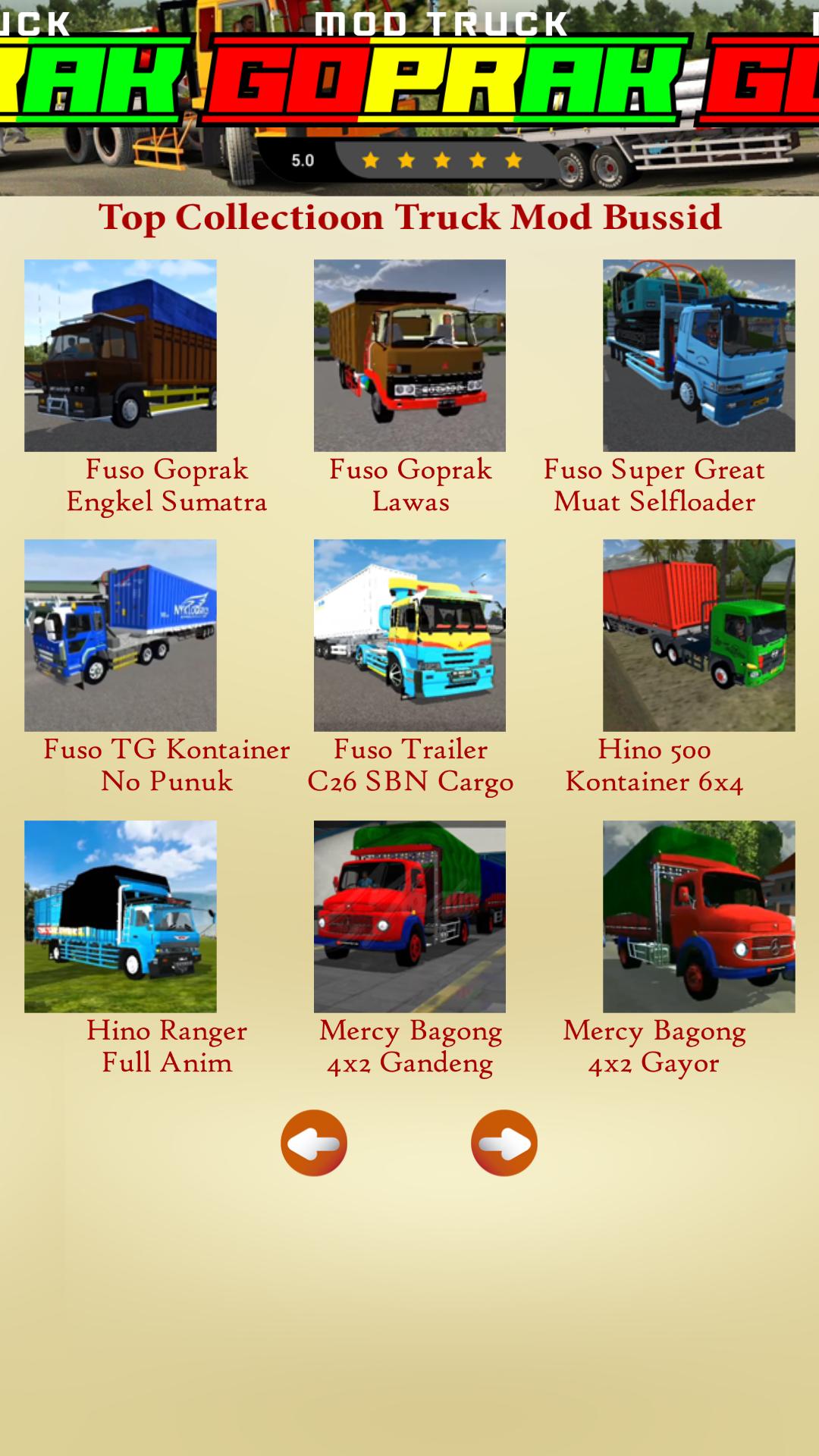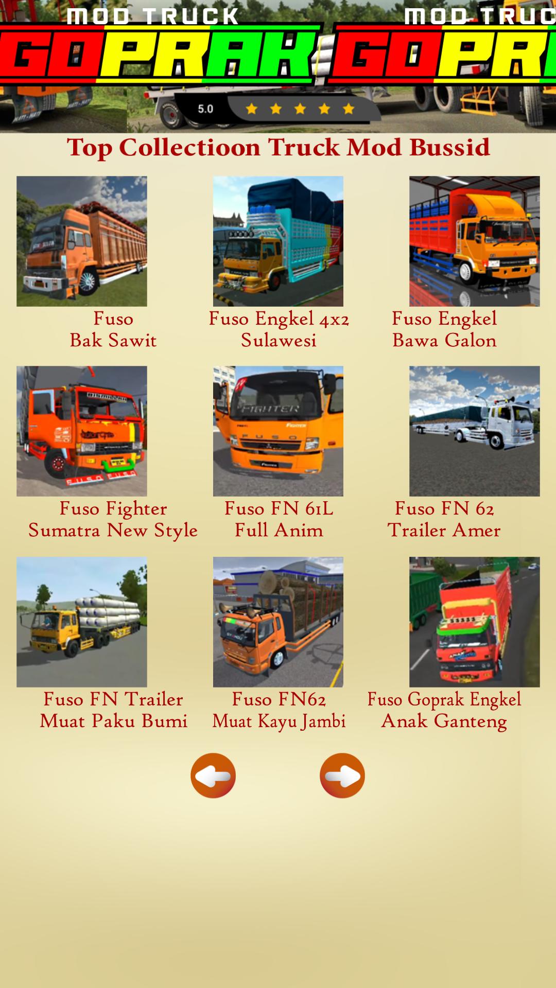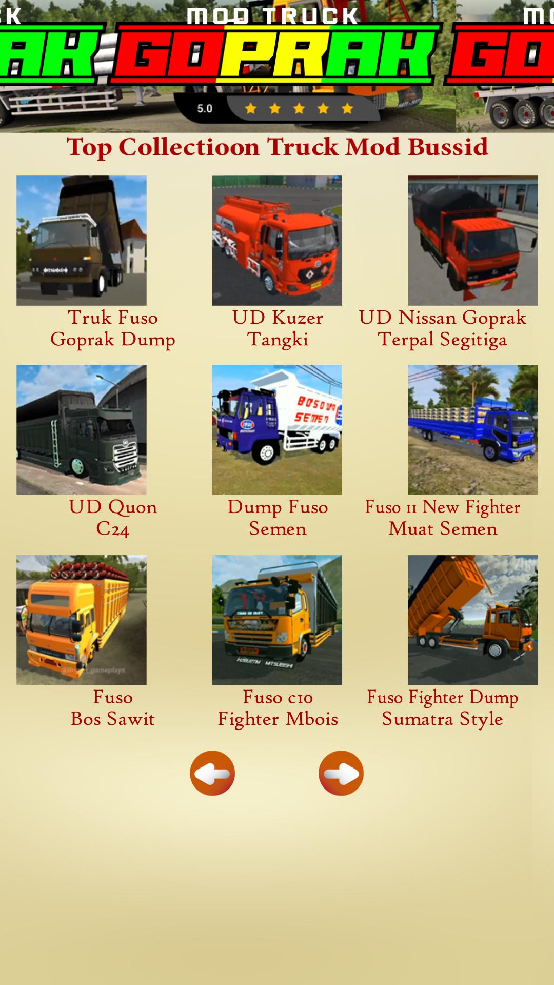 We provide various types of Fuso Goprak trucks that you can choose from. First there is the smallest bussid fuso goprak ankle mod. Then there is the Fuso Goprak dump truck mod with the latest variations. You can try the fuso goprak dump bussid truck mod with various tank variants. There is also a Fuso Goprak dump tronton with super heavy loads. There is also a bussid truck fuso goprak trailer mod for those of you who want a trailer. And most recently there is the latest variant of the famous SBN fuso goprak bussid mod. You can try all of these goprak mods. You can test drive the goprak mod as you like just with this application.