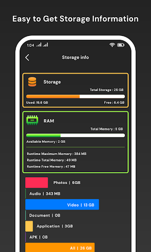 - In Storage Info, Show Information storage used by photos,Audio,video,documents,Applications, Apk And All of them, And Also display RAM Information.