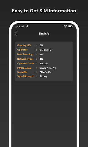 - In Sim Info, Show information related sim card is Country IS, Operator, Data Roaming, Network Type, Operator Code, IMEI Number, Serial No, Signal Strength.