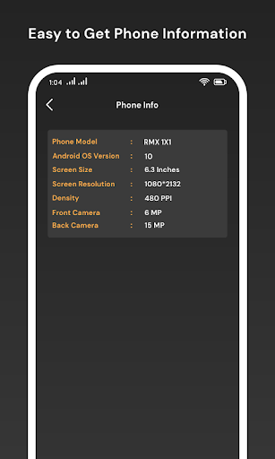 - In Phone Info, Show information about Device is Phone Model No, OS version, Screen Size, Screen Resolution, Density, Front And Back Camera.