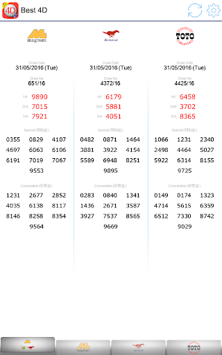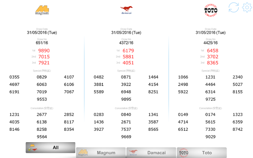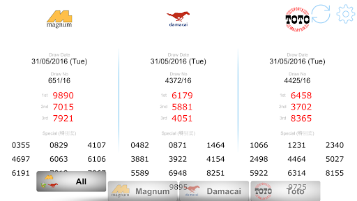 You can check out All Malaysia 4D LIVE Results from Magnum, DaMaCai and Sports Toto at the same time in a Single Page.