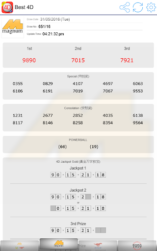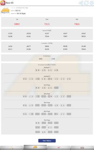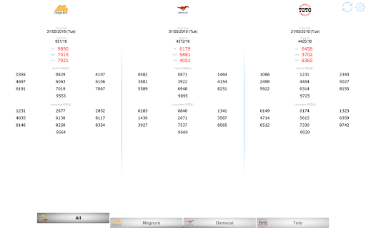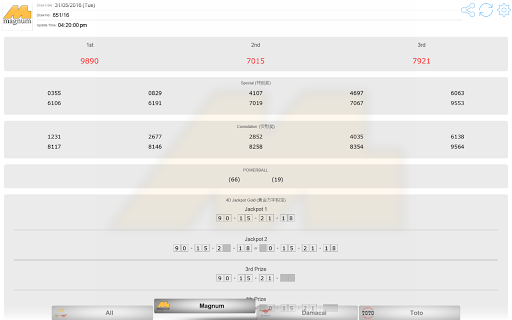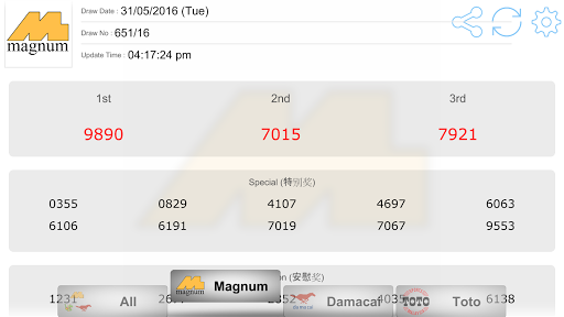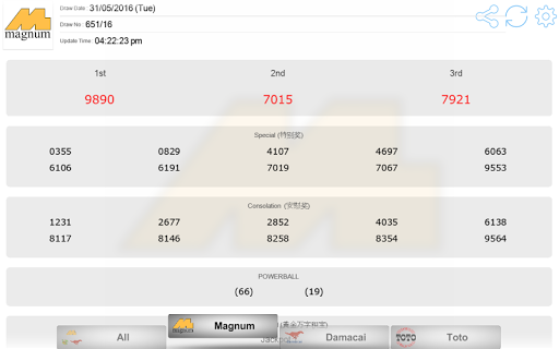 Supports Magnum 4D, Magnum Jackpot Gold, Magnum Powerball, DaMaCai 1 3D and Sports Toto 4D / 5D / 6D / Jackpot