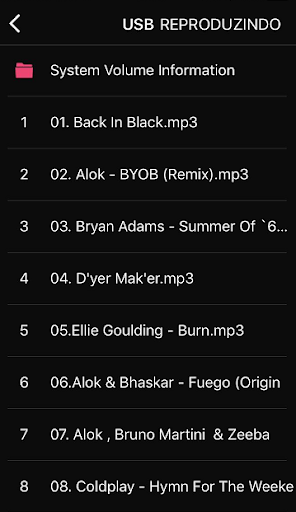 - Ver a lista de reprodução do seu dispositivo USB na tela do seu smartphone.