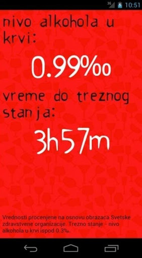 This app uses WHO empiric formula to estimate your Blood Alcohol Content based upon weight, gender, time elapsed and amount of drink.