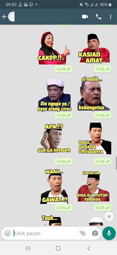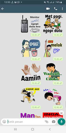 Stiker wa ambyar, arep guyu kok wedi lemu, berisik lu, wayahe, mari kita jaga nkri, aku ra popo, selamat pagi, lemburan cair, mijit yang semangat kaka, insentif rapelan, muke gile, gombal, sepi, lemes, bete, tahu, keren, nyimak, terserah lodeh, se7, paan ci, pinter, biar semua tahu, gak nangka, peluk, cuka cuka lodeh, nyimak wawon, terima kasih sudah diberitahu, gak gelas, mendoan anget, siyap, mencoba meresapi, gak nyangka, nyi-max, anti dia obat supaya cepet move on, iya aku tahu, sikat miring, panutan, aneh tapi nyate, nasib anak kost, gue yang nembak dia yang dapat, arab maklum, aku deg degan, pekok pekok, aku tahu tapi diam aja, kacao, minum dulu nak, luar biawak, cakep, man taft, apa salakku, nyimak mawon, begitulah kira kira, mau ketewa tapi takut tossa, nih duit