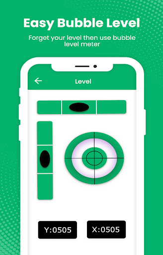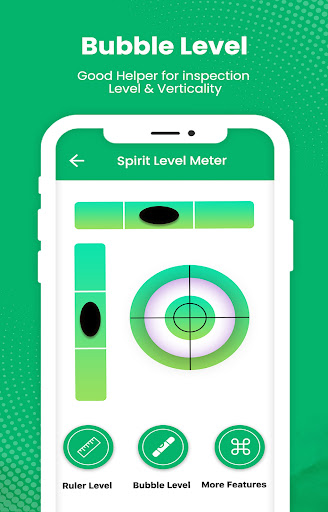 Bubble Level app also features a bull's eye level meter which is a circular, flat-bottomed device with the liquid under a slightly convex glass face with a circle at the center. It serves to level a surface across a plane, while the tubular level only does so in the direction of the tube. Bubble Level app tries to mimic the real bull's eye level and displays the data as real bull's eye level meter would.