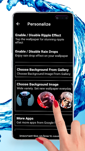 Our FREE APPLICTION has a nice addition. this is a water ripple effect! You can make any style with a whide coice of cute, cool, dope, glitter or ghetto live wallpapers! It will be easy in customizing for kids, teens and adults. Your smartphone will thank you for this APP because it cares about battery charge and mamory space!