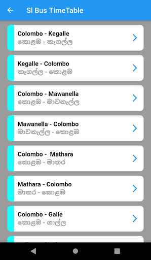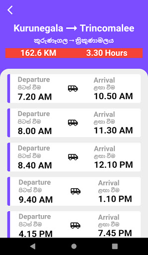 With this app, you can easily get the schedules of the buses running on the main network routes in Sri Lanka. The destination time is also speculated and I hope to add more schedules in the future.