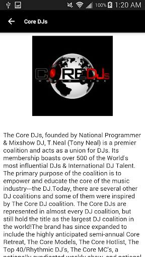 The Core DJs, founded by National Programmer & Mixshow DJ, T.Neal (Tony Neal) is a premier coalition and acts as a union for DJs. Its membership boasts over 500 of the World's most influential DJs & International DJ Talent. The primary purpose of the coalition is to empower and educate the core of the music industry---the DJ.