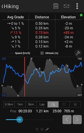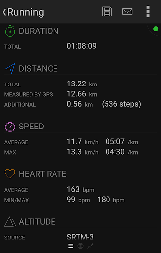 - Distance, time, current/average/maximum speed, pace, calories, step count/cadence/length, altitude, elevation gain/loss, ...