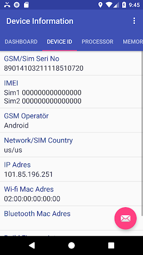 ● Device ID (IMEI - 2 imei for double SIM phones, Sim Serial Number, Android Device ID, GSM Operator, IP Address, Wi-Fi Mac and Bluetooth Mac Address)