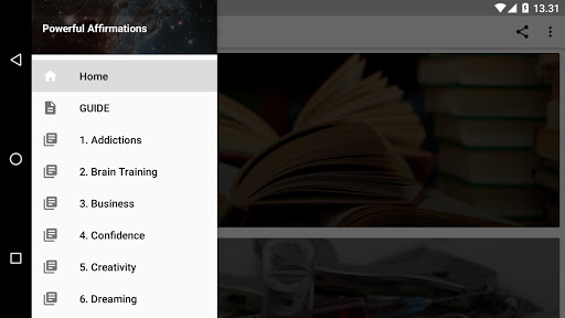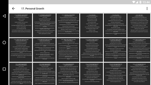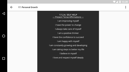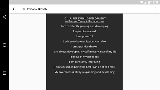 Features: affirmation categories, quick and easy navigation, user friendly interface, present tense affirmations, future tense affirmations, natural affirmations.