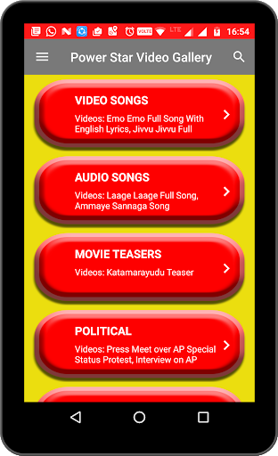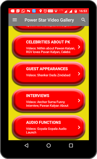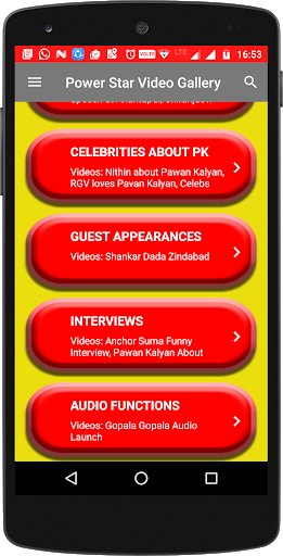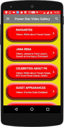 This application has all videos of Pawan Kalyan at single place. It contains different categories such as Movies, Interviews by Pawan Kalyan, Different views about Pawan kalyan and so on...