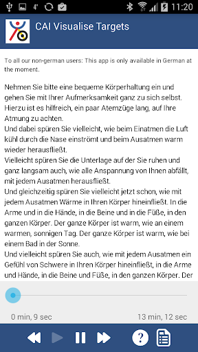 Repeatedly visualising images in a relaxed condition speeds up the imagination process and leads to a change of your entire mental state. This app is especially suitable to clarify own targets and to define measures to reach these targets. In order to automise the recalling process and to enhance the effectiveness you need a certain amount of practice.