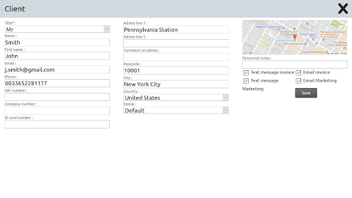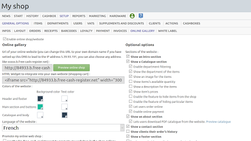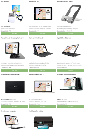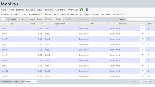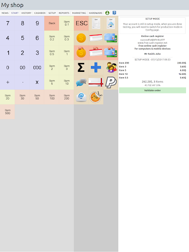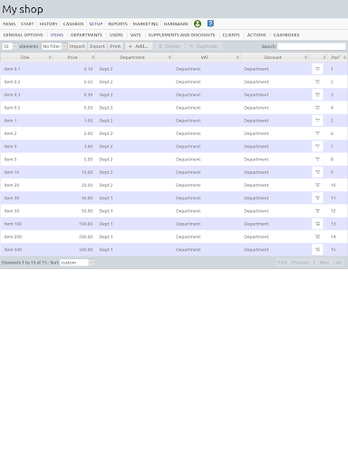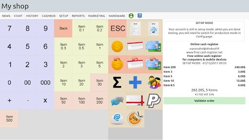 This app lets you configure a set of items belonging to departements, you can affect VATs to departments, and discounts, you can handle client accounts, print receipts (if connected to a printer), or accept credit card payment.